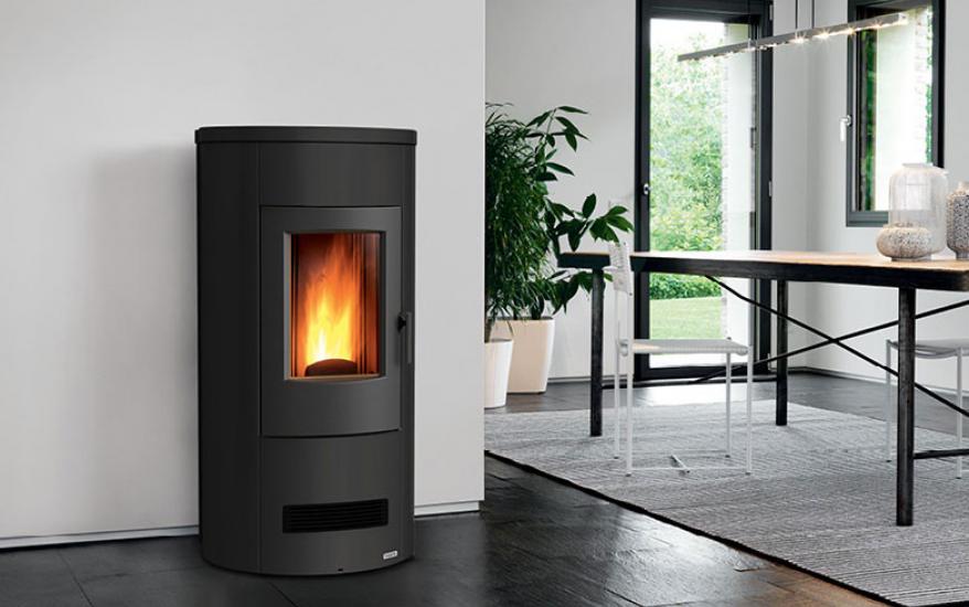 Estufa de pellets modelo P130T con revestimiento de acero, instalable a ras de pared-rincón. Clase de eficiencia Energética A+. Hogar hermético. Dispone de la función Natural Mode. Equipada de serie con modulo Wi-Fi para gestión desde la App.